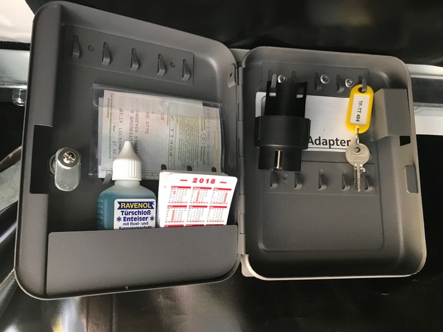 Nach Zahlungseingang senden wir dir einen Code für den Schlüsseltresor zu. An jedem Anhänger befindet sich ein Schlüsseltresor, in dem sich der Schlüssel für die Diebstahlicherung, die Fahrzeugpapiere und ein Stromadapter befinden.